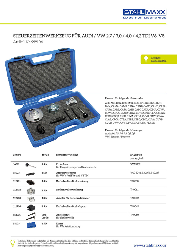 Vergleichsnummern zu "Adapter für Kettenradspanner, wie VAG T40062"