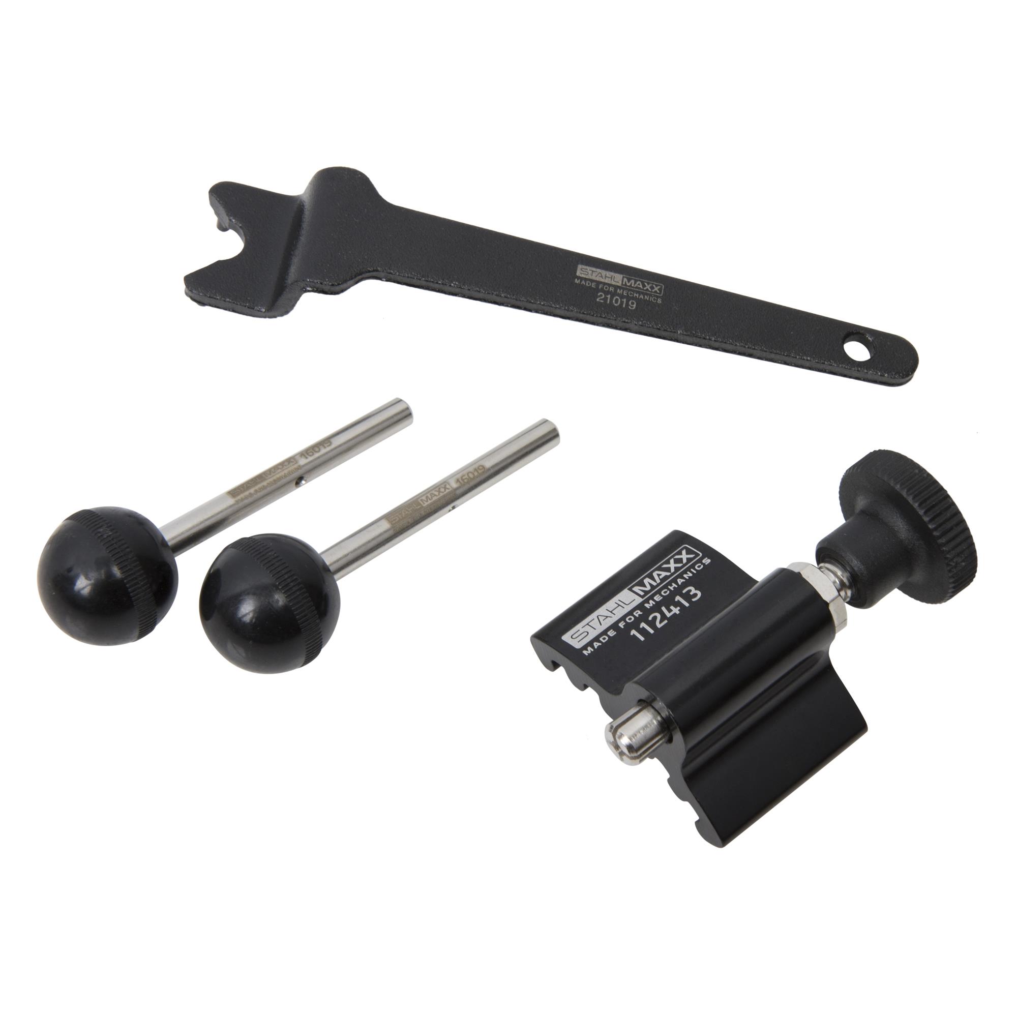 HINWEIS: Das Absteckplättchen, zu verw. wie T10008, wird für VAG Motoren ab ca. 2002 nicht mehr benötigt. Dafür werden bei manchen Motoren 2 Arretierdorne zum Arretieren der Nockenwelle benötigt.