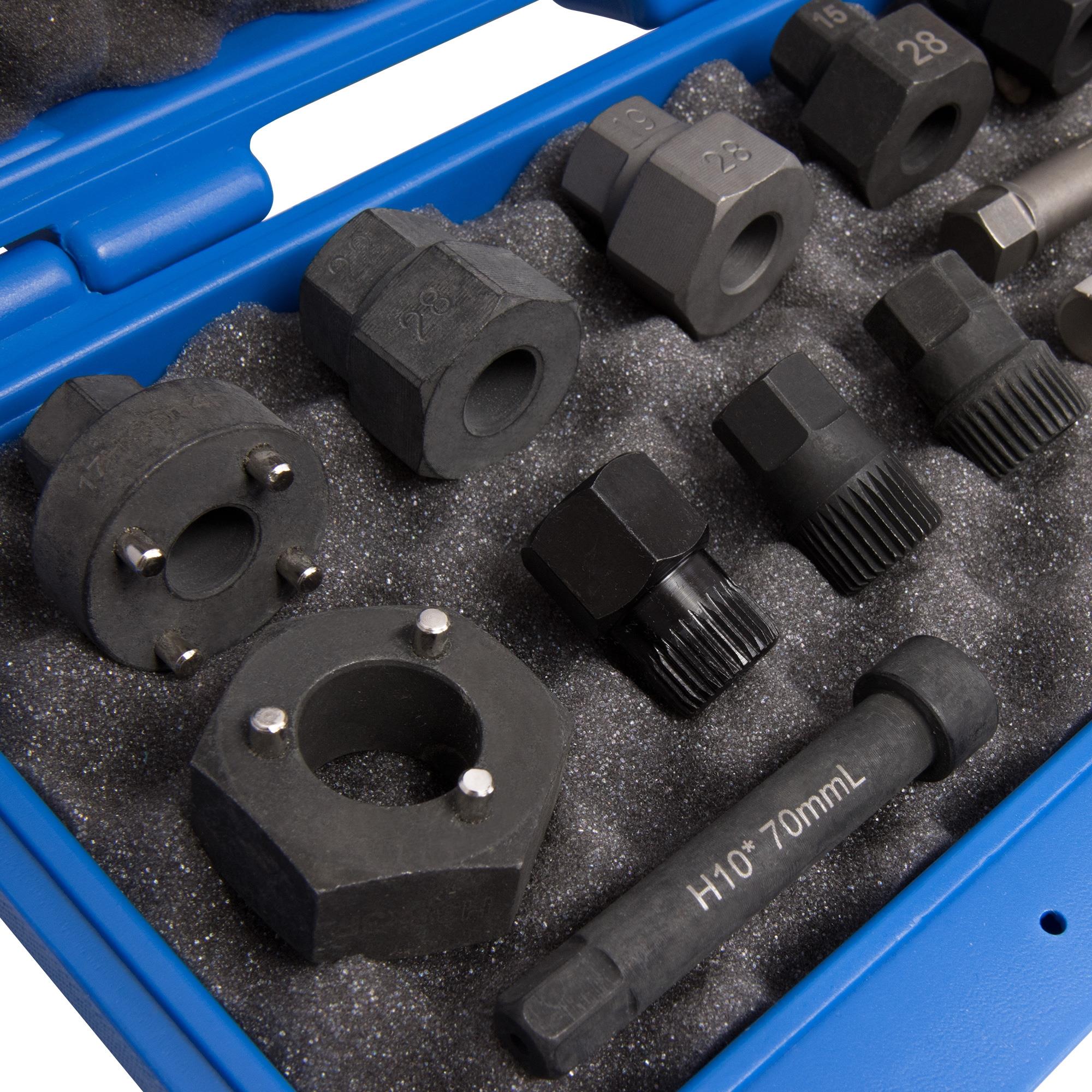 Mit diesem Spezialwerkzeug-Satz kann die Freilauf-Riemenscheibe der Lichtmaschine bei nahezu allen Fahrzeugen gewechselt werden. Mit den im Set enthaltenen Gegenhaltern wird die Lichtmaschinenwelle fixiert, um dann mit dem passenden Steckschlüssel die Verschraubung zu lösen.