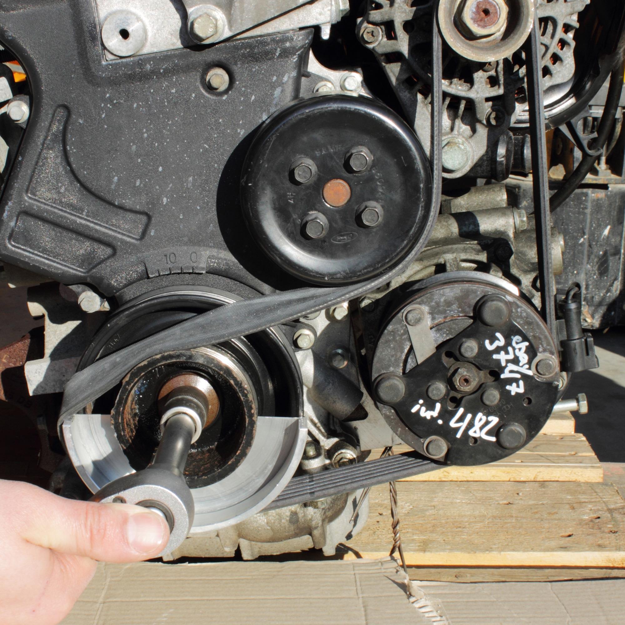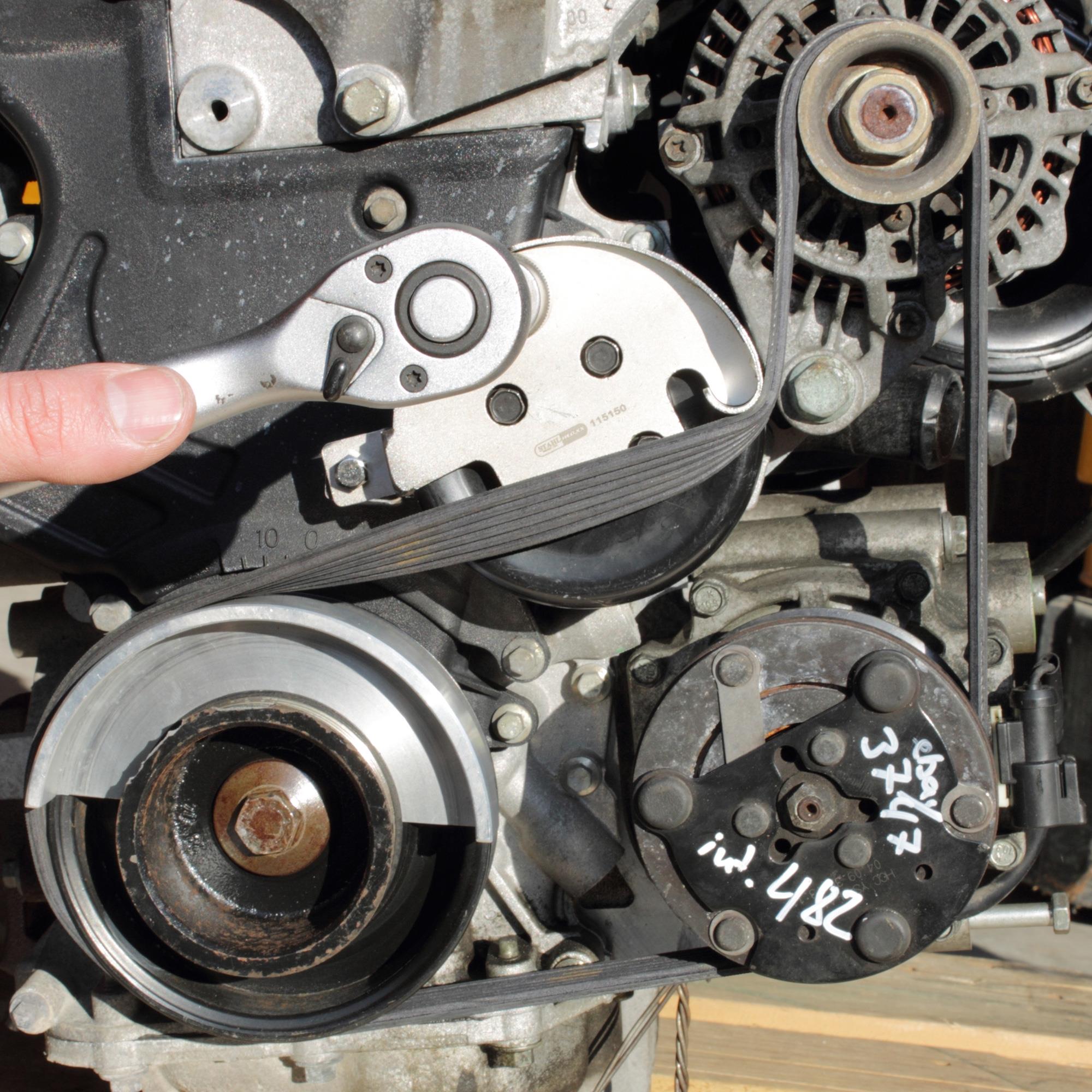 Ein Aufziehen des Riemens wird durch die Wasserpumpenriemenscheibe erreicht – bei doppelten Riemenscheiben (mit Klimaanlage) muss das Zwischenblech eingesetzt werden, sonst wird der selbstspannende Keilriemen überdehnt oder beschädigt.