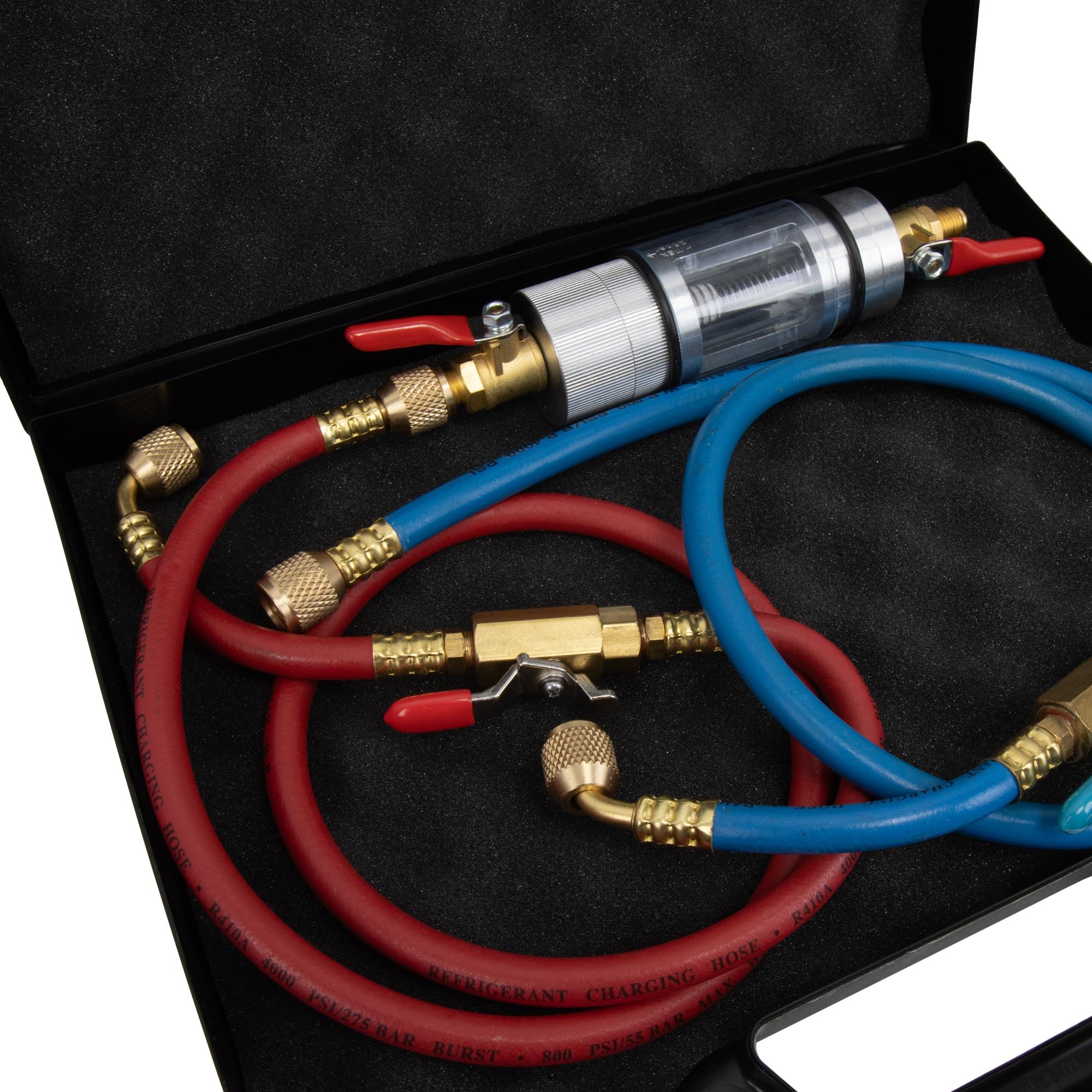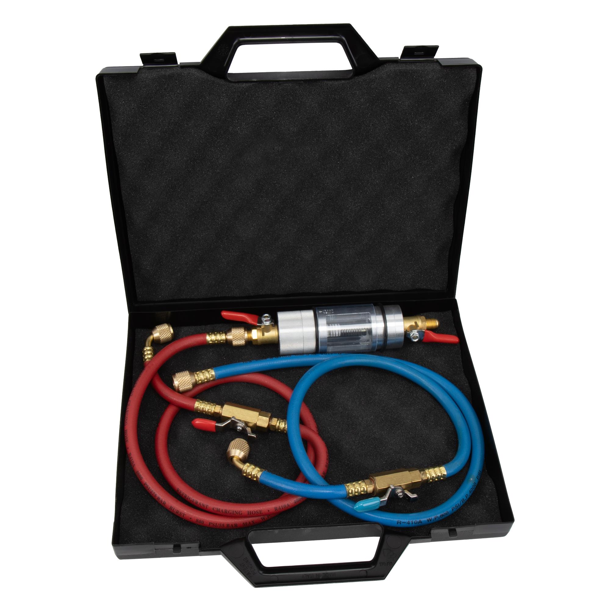 Mit diesem Diagnose Set für Klimaanlagen mit Schutzfilter kann über das Schauglas eine Schnelldiagnose über den Zustand und eventuelle Beimischung des Kältemittels mit Fremdstoffen, Späne, UV-Lecksuch- und Dichtmitteln ermittelt werden.