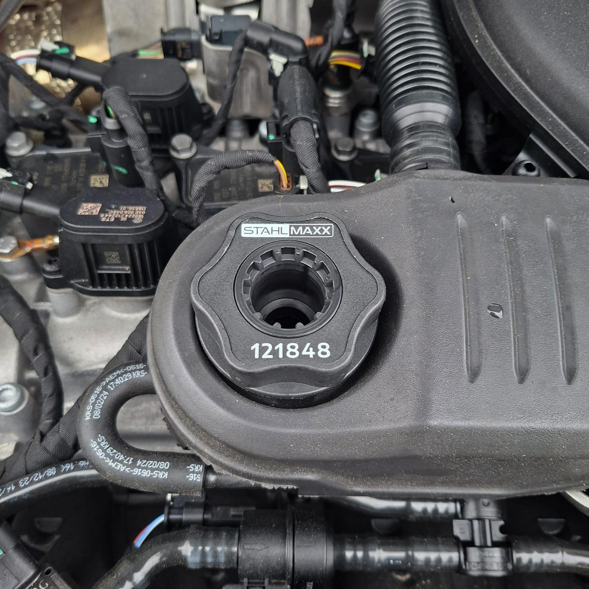 Der Original Einfülldeckel wird über 4 Haltenasen verrastet. Diese werden zur Ölbefüllung nicht benötigt, daher haben wir bei unsererm Einfülldeckel auf die Haltenasen verzichtet. Die Abdichtung übernehmen O-Ringe. Diese dichten – je nach Bauart – im Inneren des Nockenwellengehäuses, des Ventildeckels bzw. der Nockenwellenabdeckung ab.