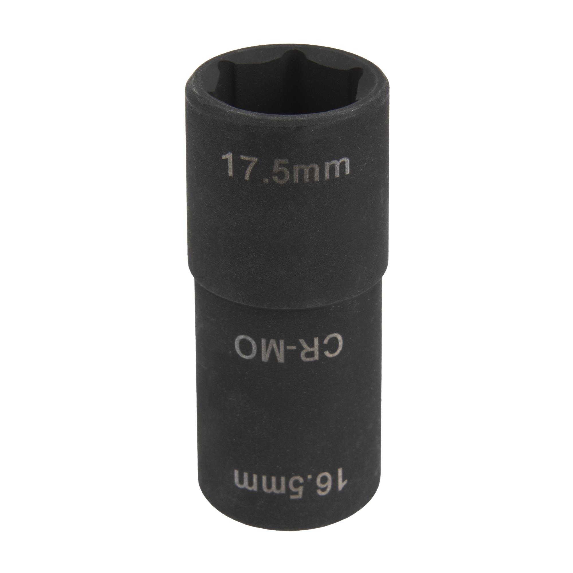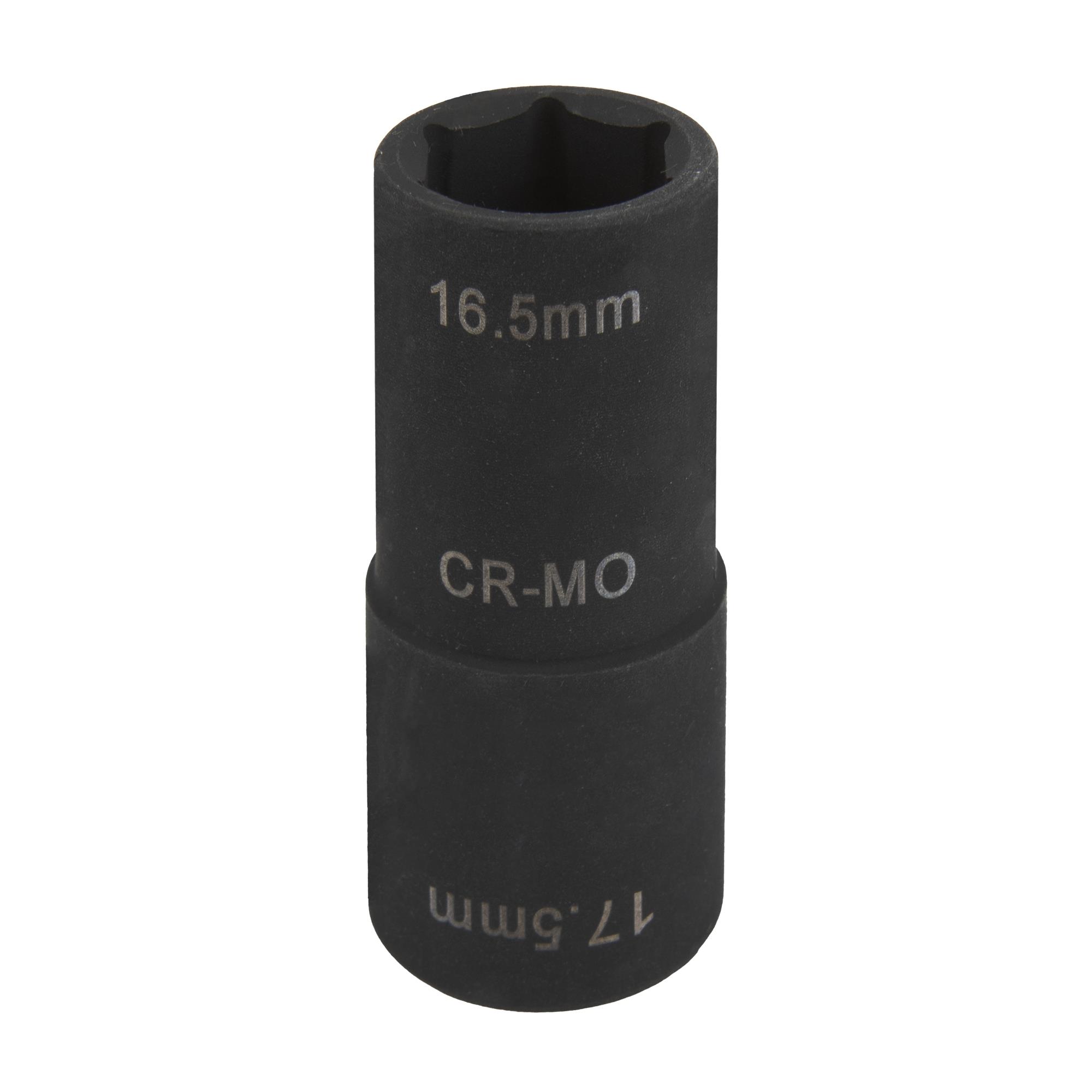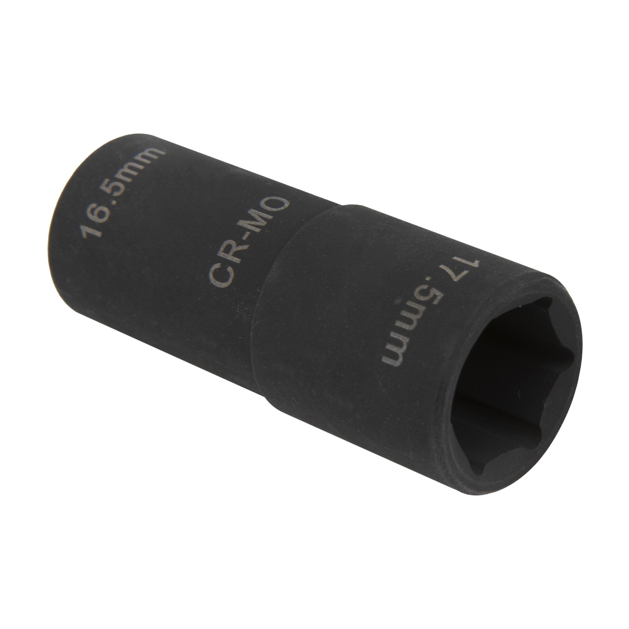 Dieser doppelseitige Steckschlüsseleinsatz löst beide Probleme durch ein 16,5-mm-Ende und ein 17,5-mm-Ende. Der Antrieb erfolgt durch einen innen liegenden 4-Kant der Größe 1/2" (12,5 mm).