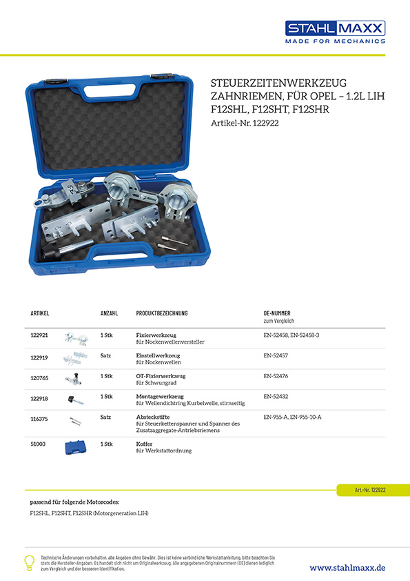 Spezialwerkzeugsatz für das fachmännische Einstellen der Steuerzeiten bei der ab 2019 verbauten LIH Motorgeneration von Opel, mit 1,2 Liter F12SHL, F12SHT, F12SHR Motoren.
