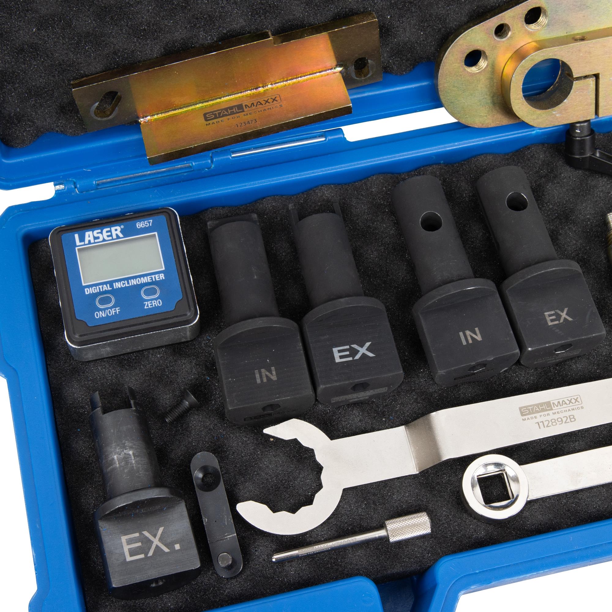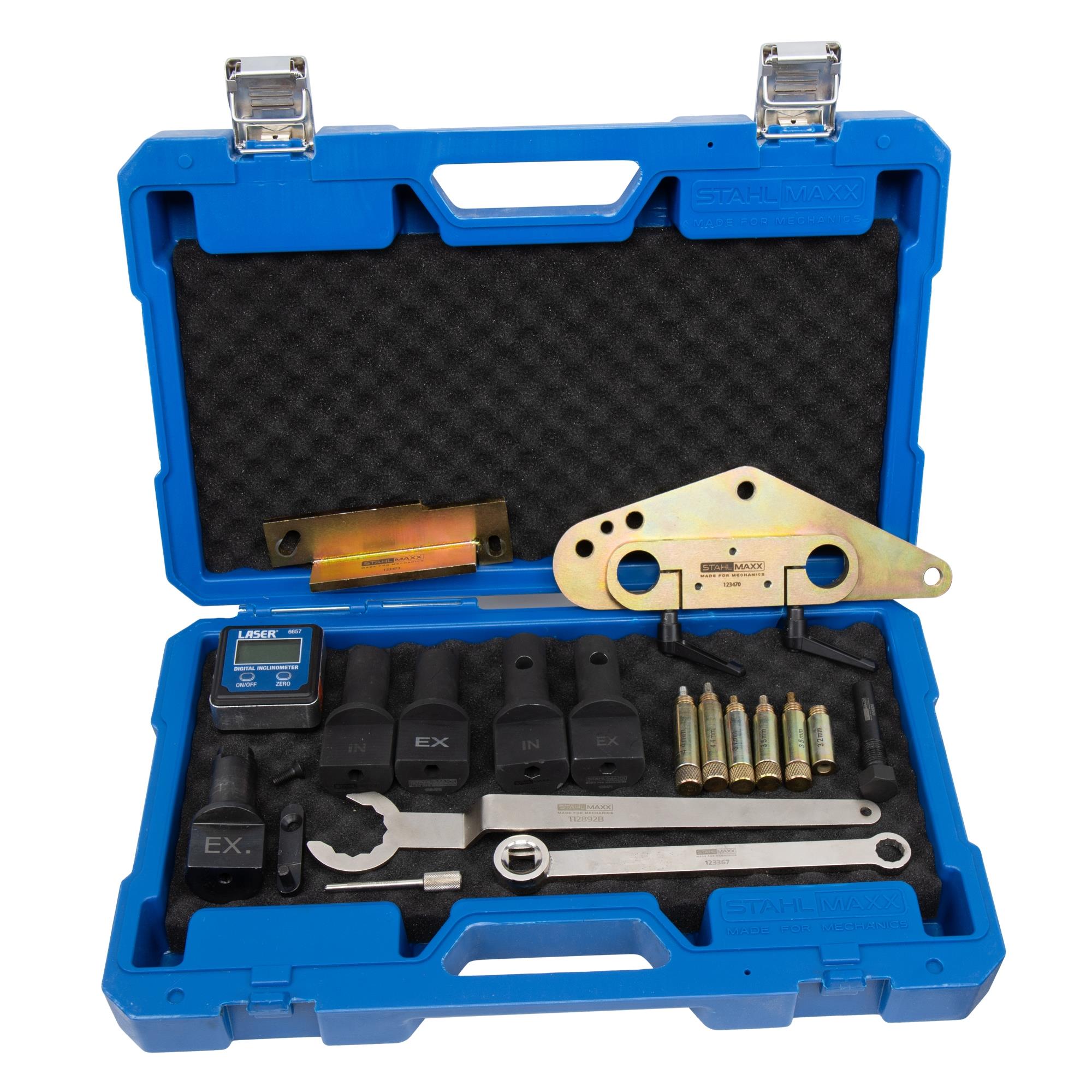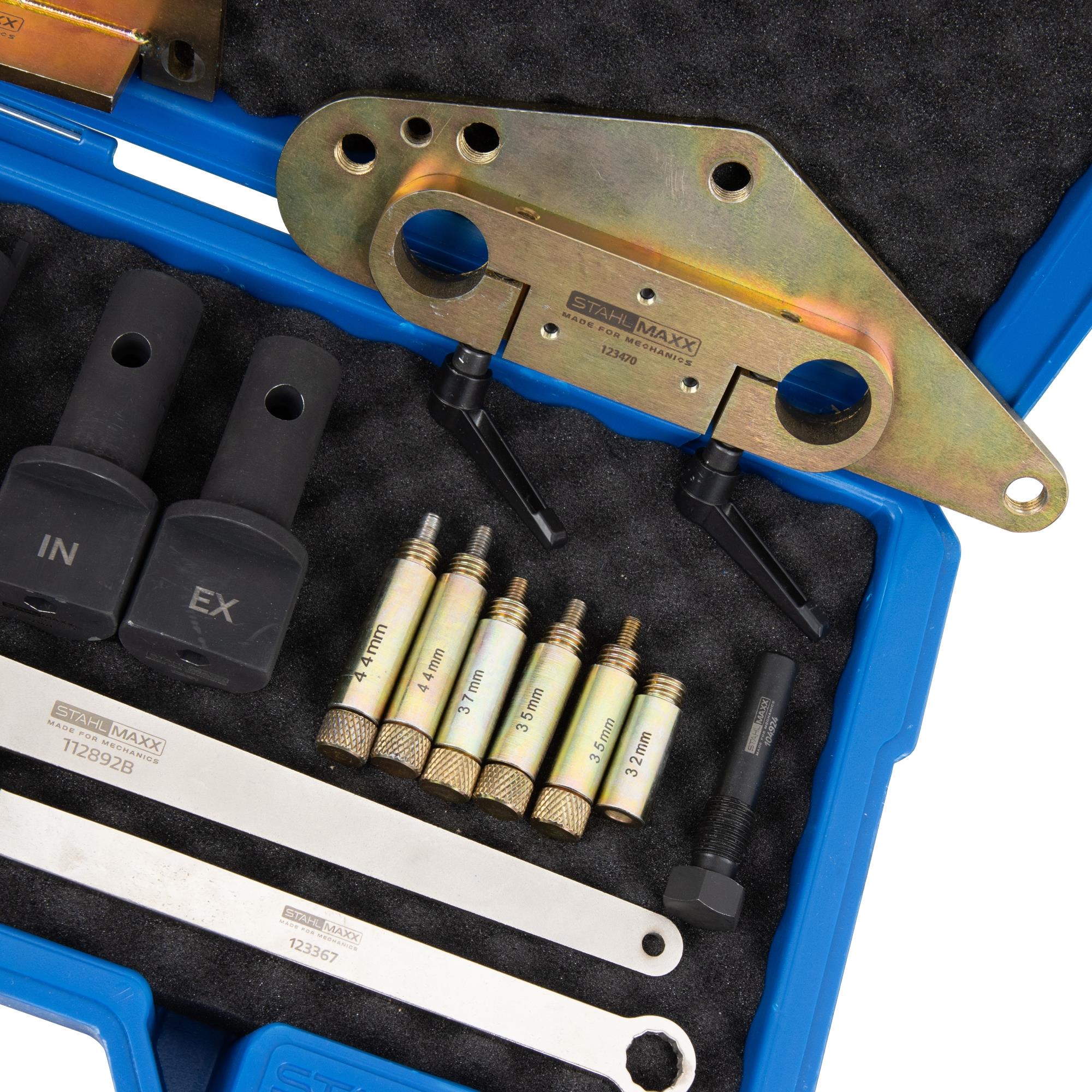 Steuerzeitenwerkzeugsatz von STAHLMAXX, zur Grund- und Feineinstellung der Nockenwellen- und Kurbelwellenposition, an modernen, zahnriemengetriebenen TSI, TFSI Motoren von VW, Audi, Seat, Skoda und Cupra.