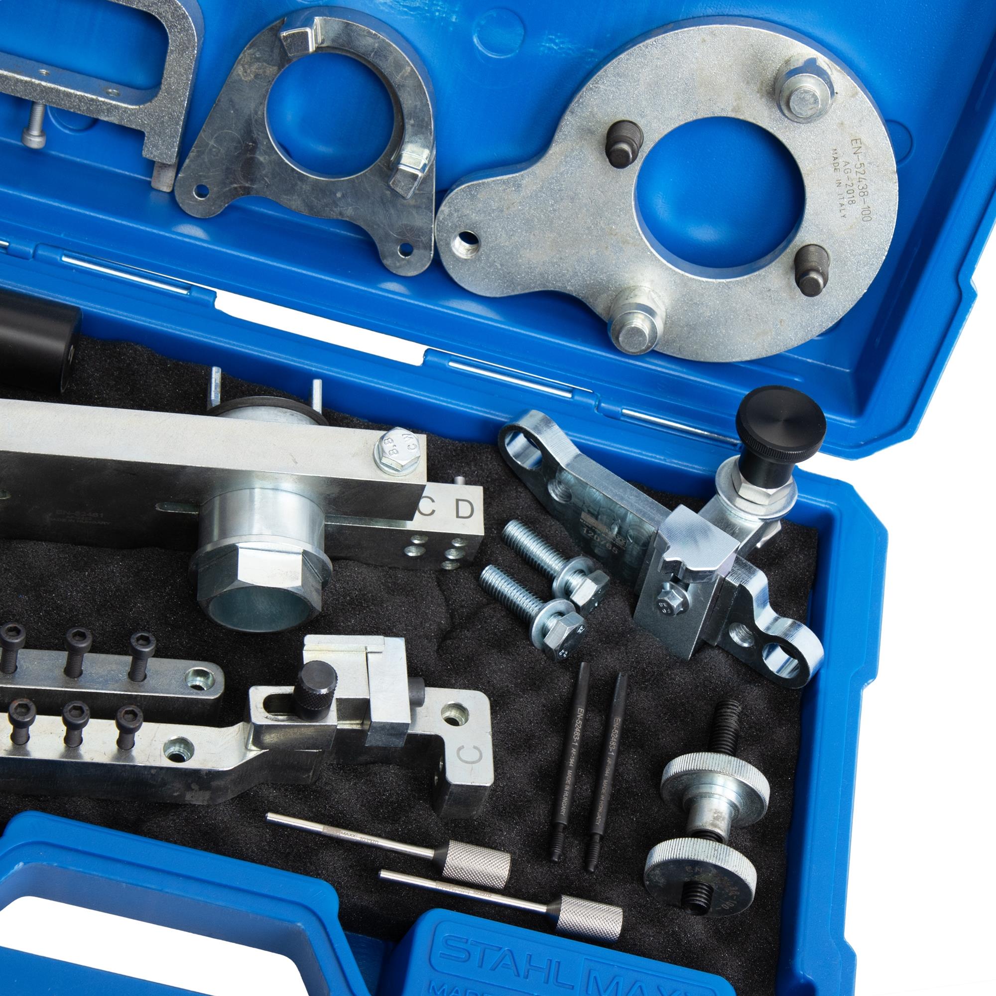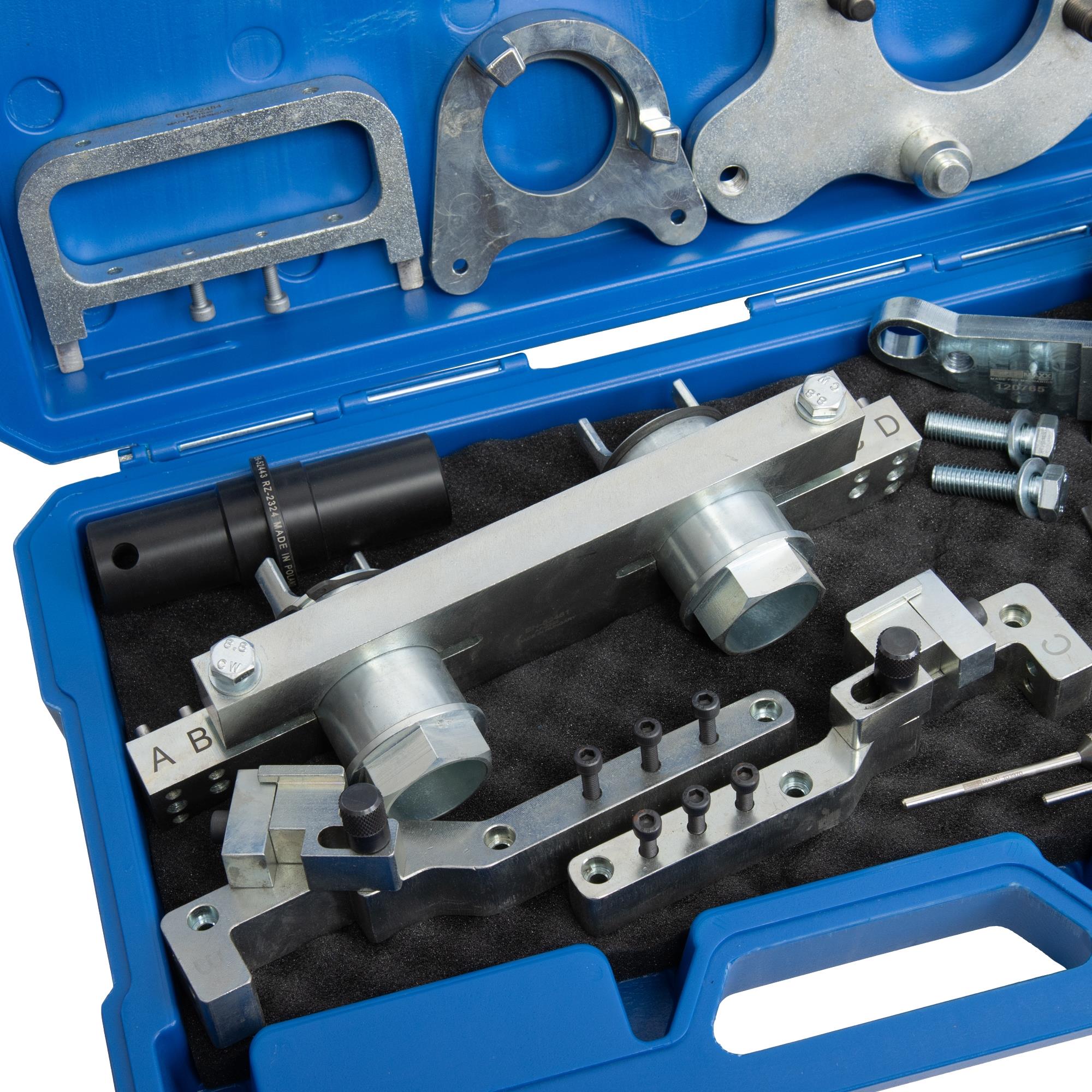 Enthält alle zwingend benötigten Werkzeuge zur De-, Montage und Einstellung für Nockenwellen, Steuerkette, Ausgleichswelle, Nockenwellenversteller, Zylinderkopf, Steuergehäusedeckel und Kraftstoff-Hochdruckpumpe.