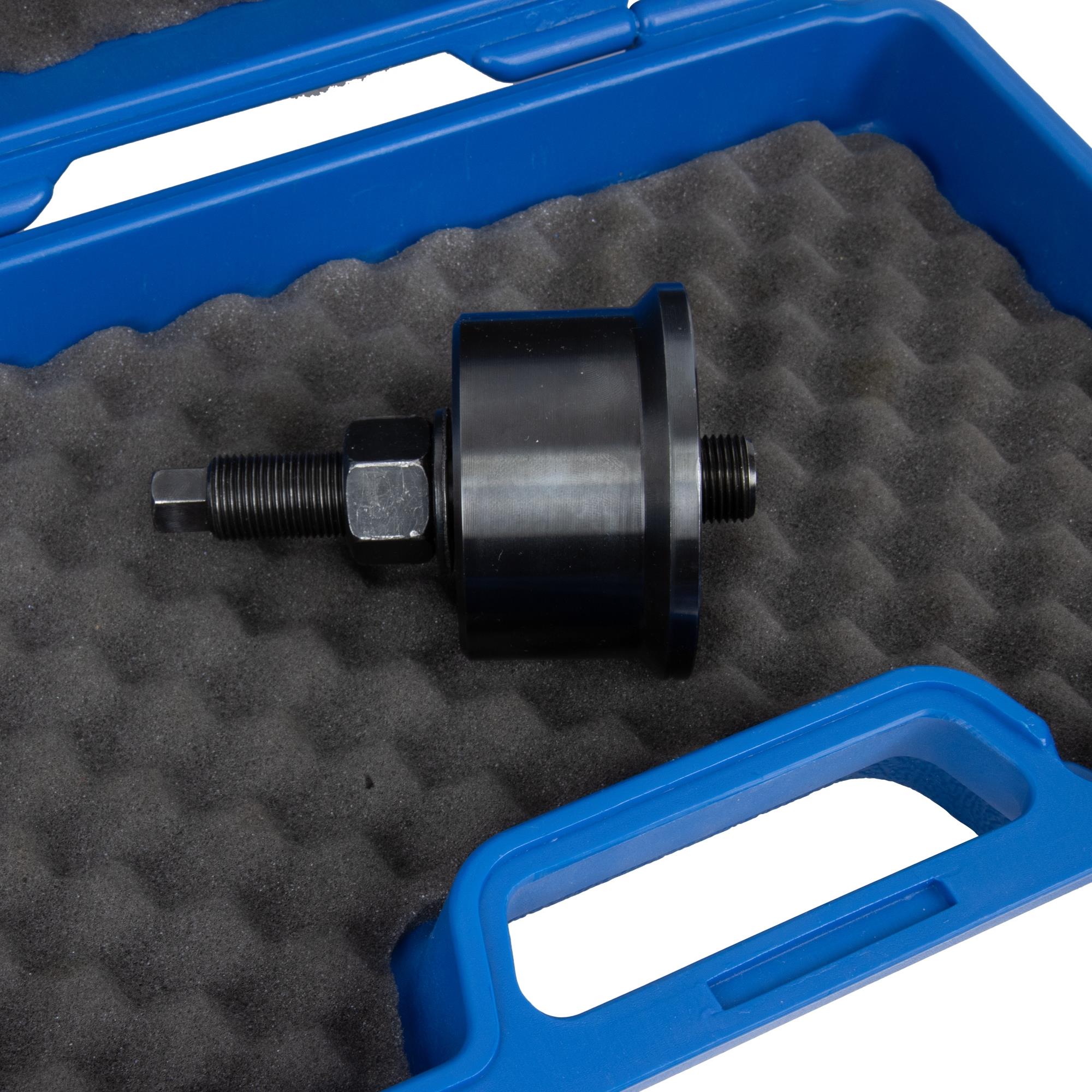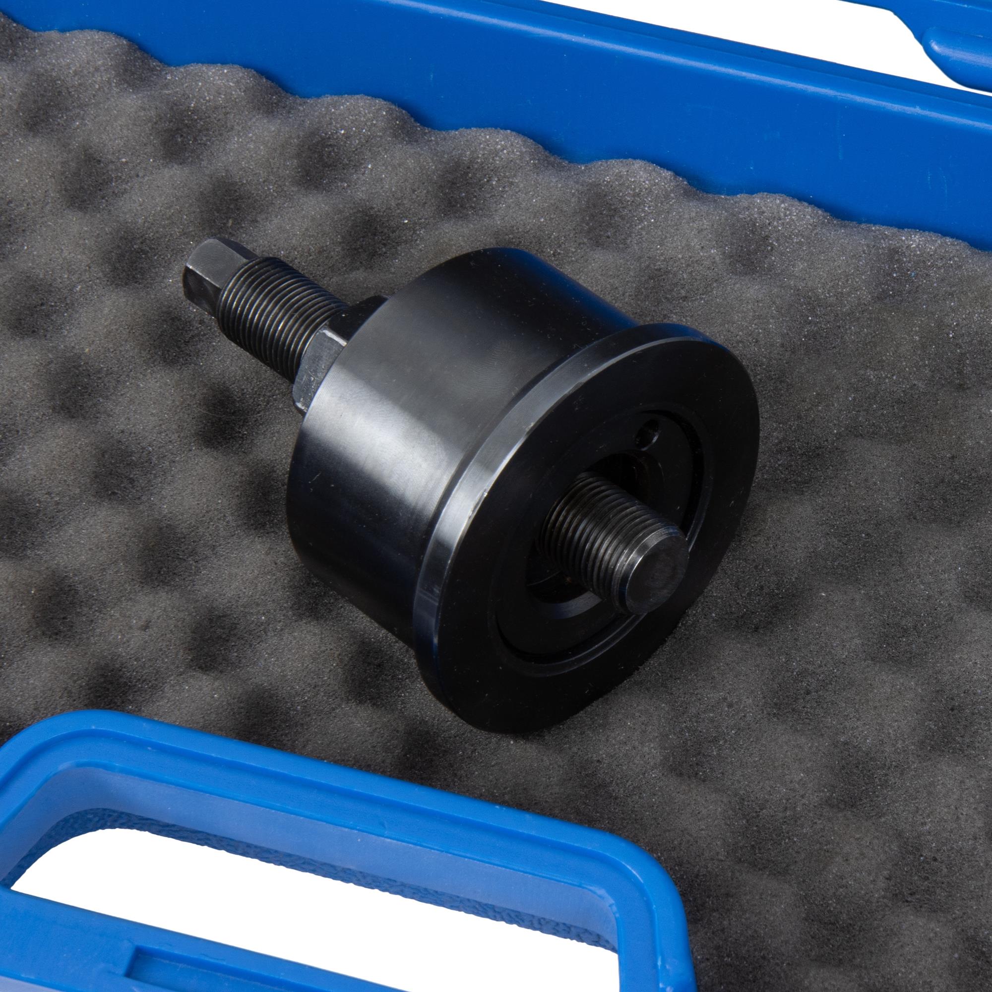 Der Dichtring wird mit einer Metallhülse präzise auf den Kurbelwellenstumpf gepresst. Gleichzeitig wird das Steuergehäuse korrekt ausgerichtet, sodass eine fachmännische Montage problemlos möglich ist.