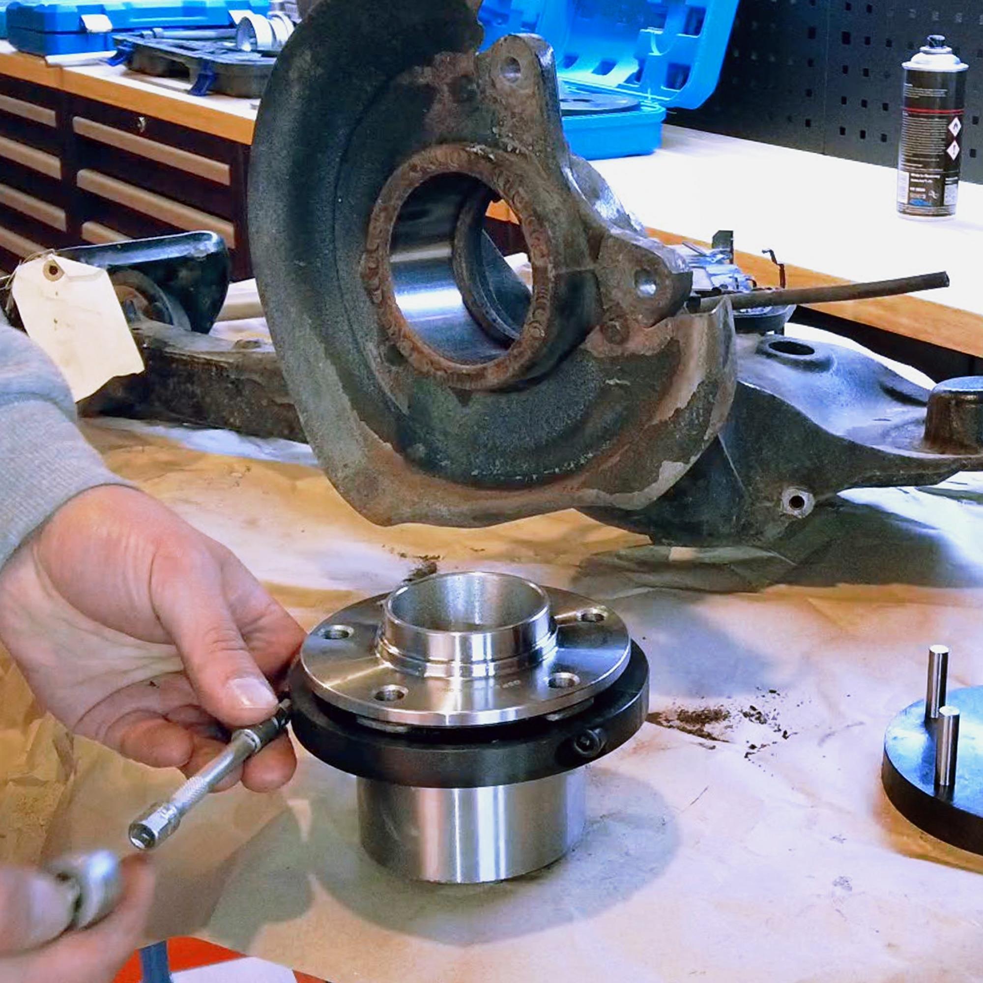 Mit diesem Werkzeug ist es möglich die Kompletteinheit Radlager/Radnabe an der Hinterachse zu wechseln, ohne den Achschenkel auszubauen. Der Komplette Demontage- und Montagevorgang findet direkt am Fahrzeug statt.