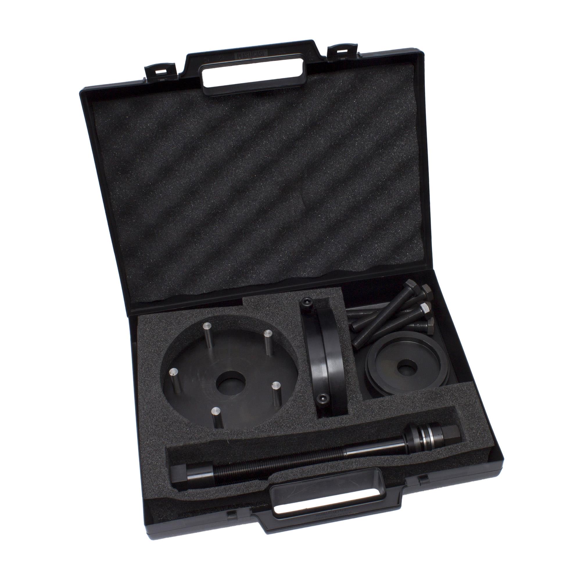 Spezialwerkzeug-Satz zum Aus- und Einpressen von Kompaktradlagern an der Hinterachse, ohne den Achsschenkel und ABS-Sensor auszubauen. Geeignet für viele Transporter/Vans von Citroen, Opel, Peugeot und Toyota.