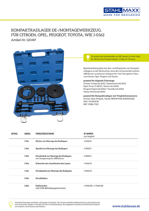 Vergleichsnummern zu "Kompaktradlager De-und Montagewerkzeug Citroen, Opel, Peugeot, Toyota, wie J-0562 - Leihwerkzeug"