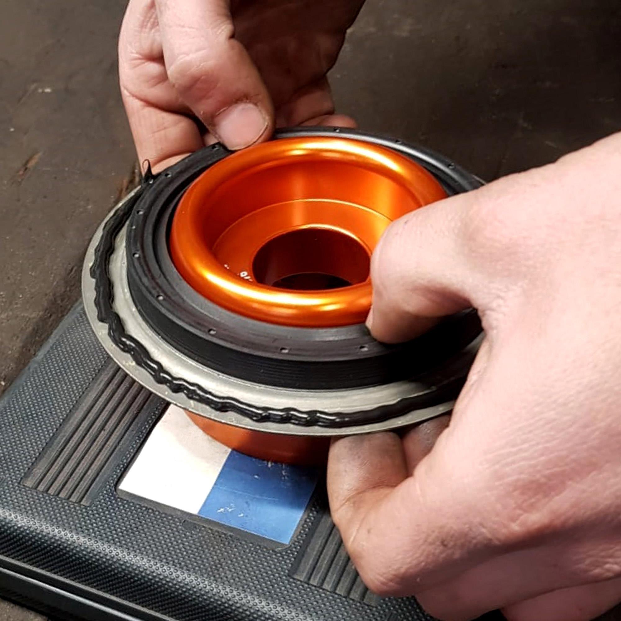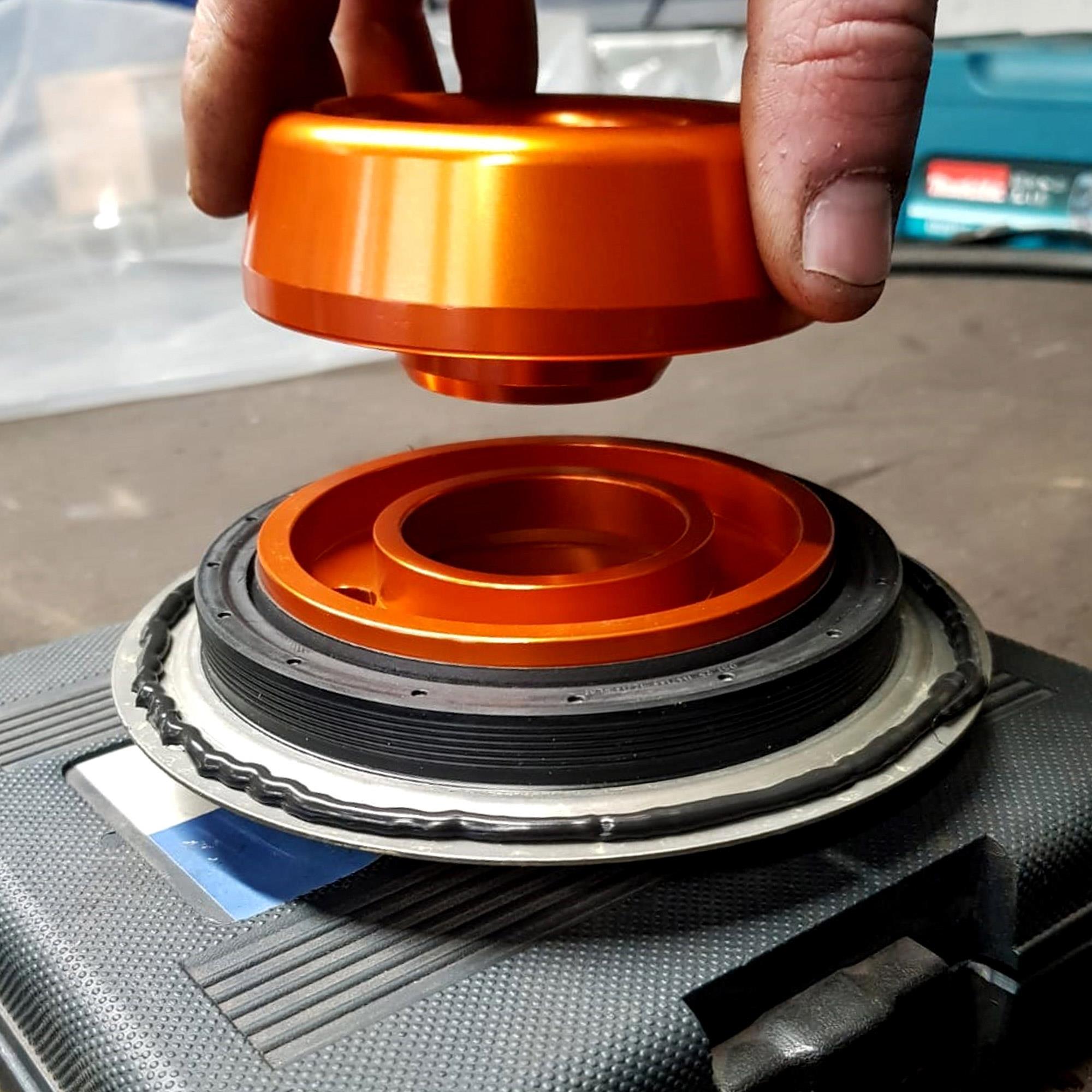 Die Montage des PTFE-Dichtrings erfolgt trocken. Es sind keinerlei Öle oder Fette notwendig. Der PTFE-Wellendichtring wird zuvor mit der Montagehilfe aufgeweitet und auf die Führungshülse aufgeschoben. Danach kann der Abschlussdeckel per Hand vollständig angedrückt und verschraubt werden.