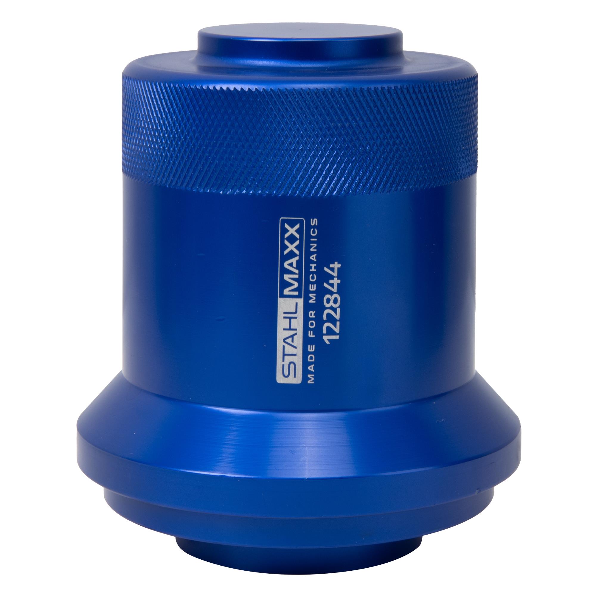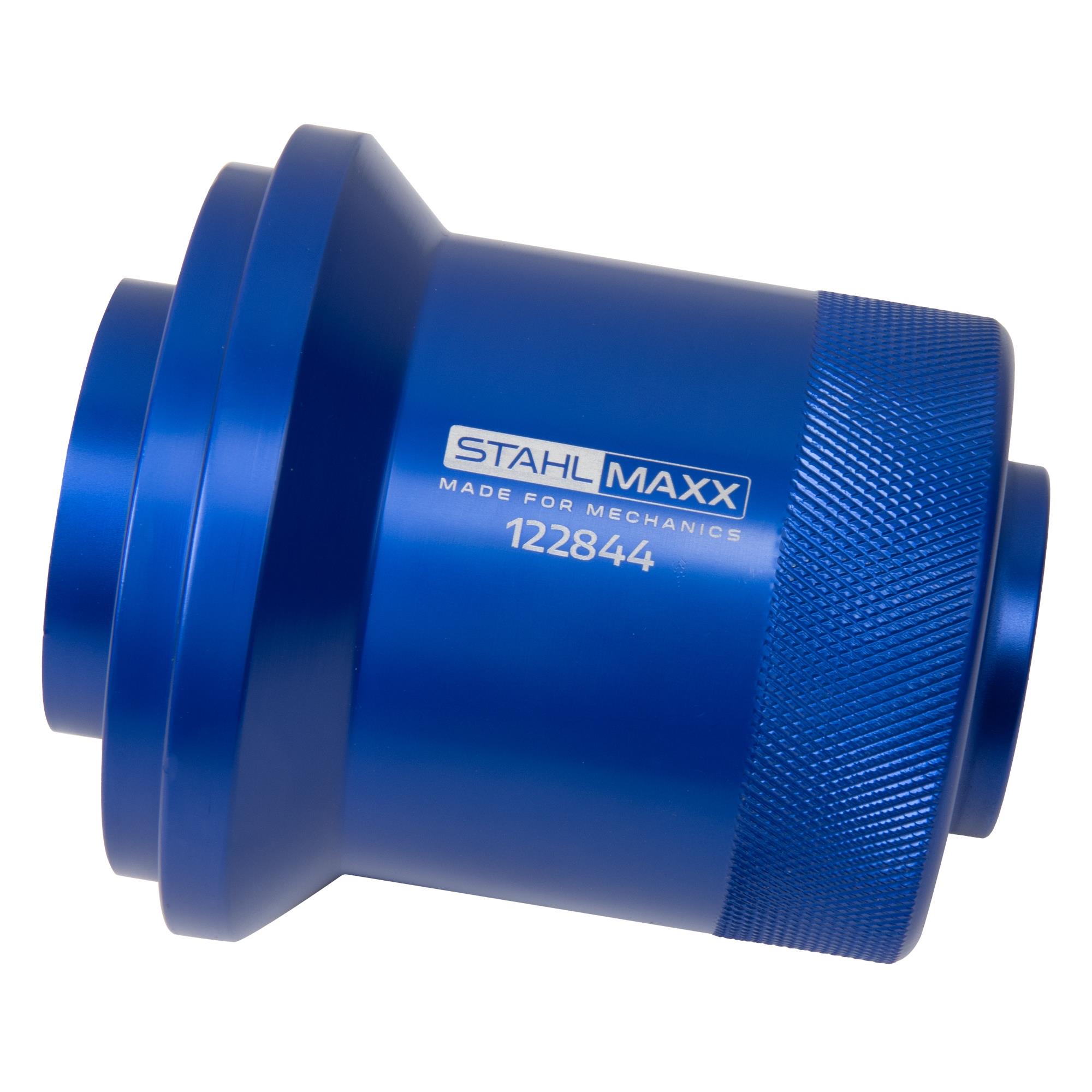 Mit diesem Eintreiber für den Radialdichtring ist sowohl die korrekte Montage, als auch die Einbautiefe vorgegeben, was einen vorzeitigen Ausfall des Dichtringes vermeidet. Der Schlagdorn wird in dieser Version nicht mehr benötigt. Der Einbau des Wellendichtringes erfolgt mit diesem Montagewerkzeug und einem Gummi-, oder Kunststoffhammer.