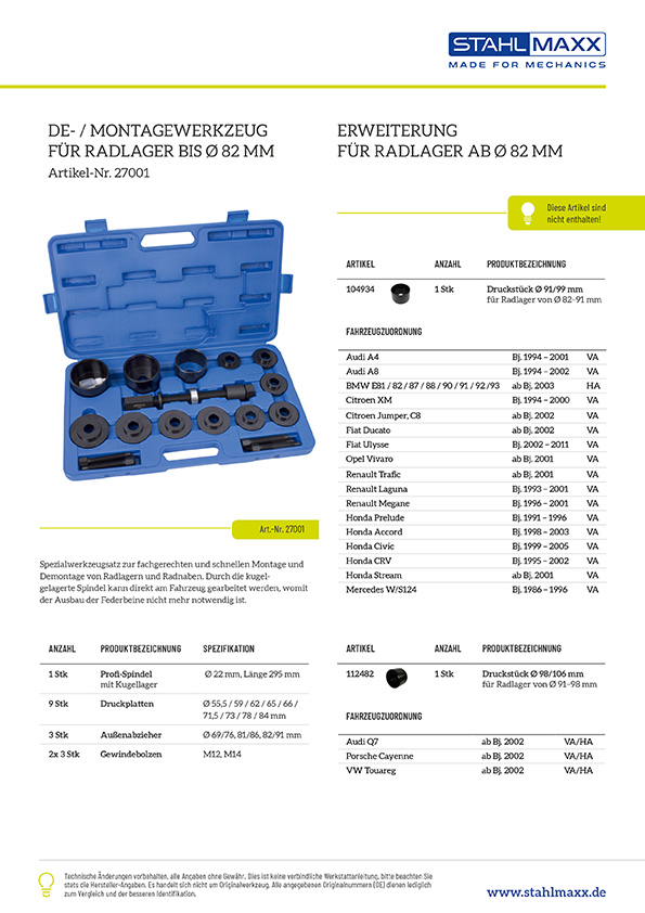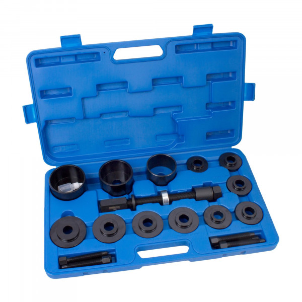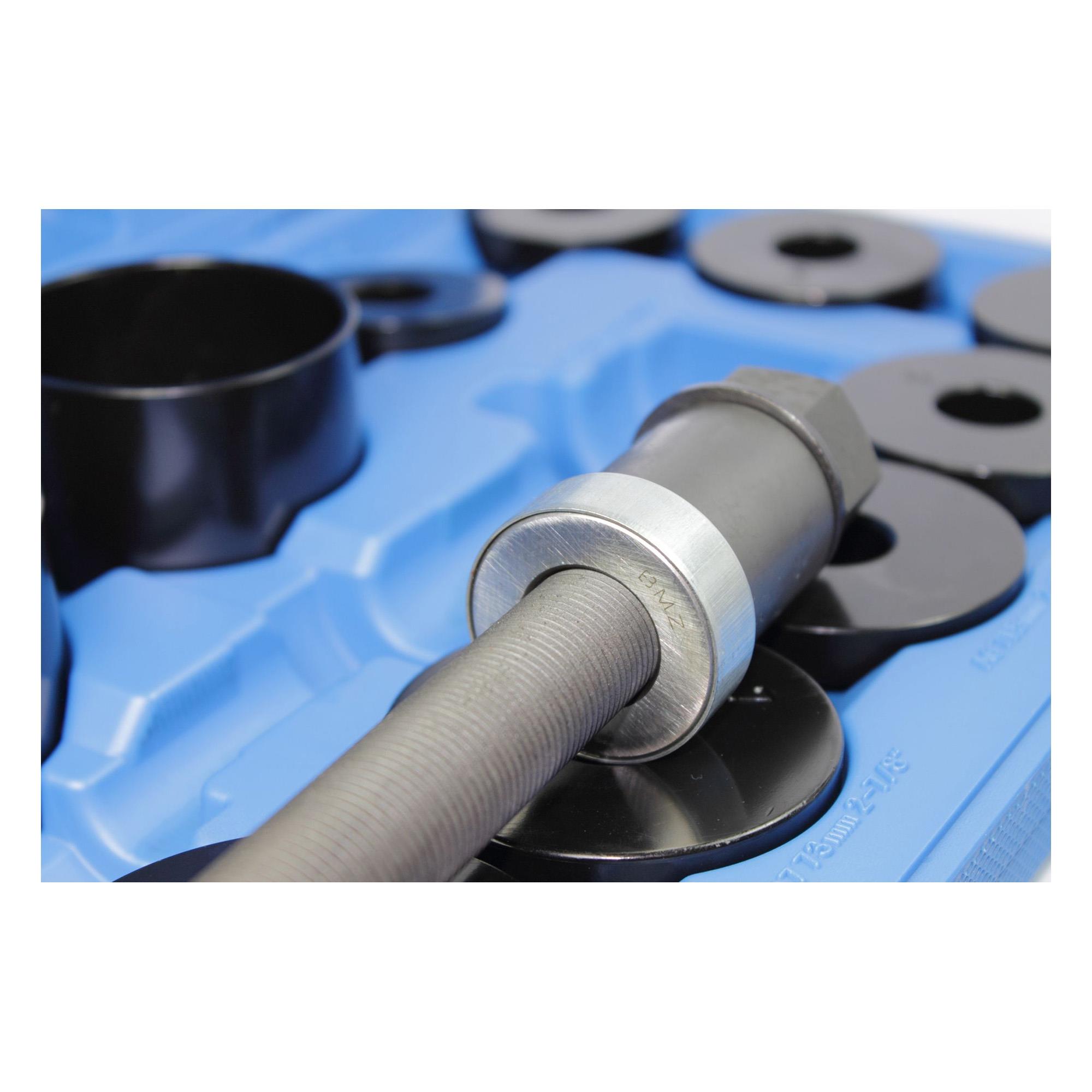 - Universeller Spezialwerkzeug-Satz für den Wechsel der Radlager an der Vorderachse und Hinterachse der meisten Fahrzeuge. Ausführung in Profi-Qualität mit kugelgelagerter aus dem ganzen gefräster Spindel.