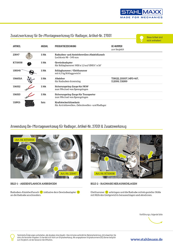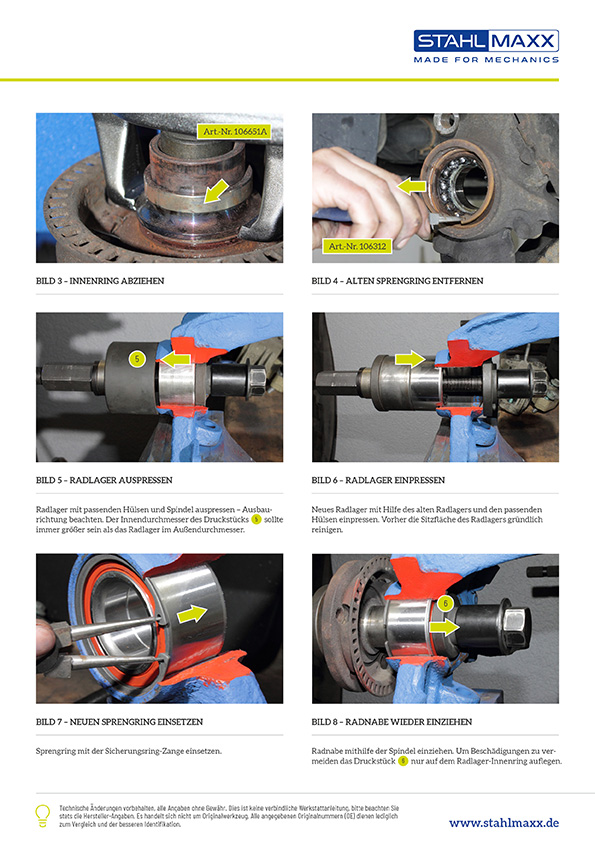 Nach dem Montieren des neuen Radlagers, benötigen Sie allerdings ein weiteres Werkzeug (Art Nr 50006) um die Radnabe wieder in das Radlager einzuziehen.