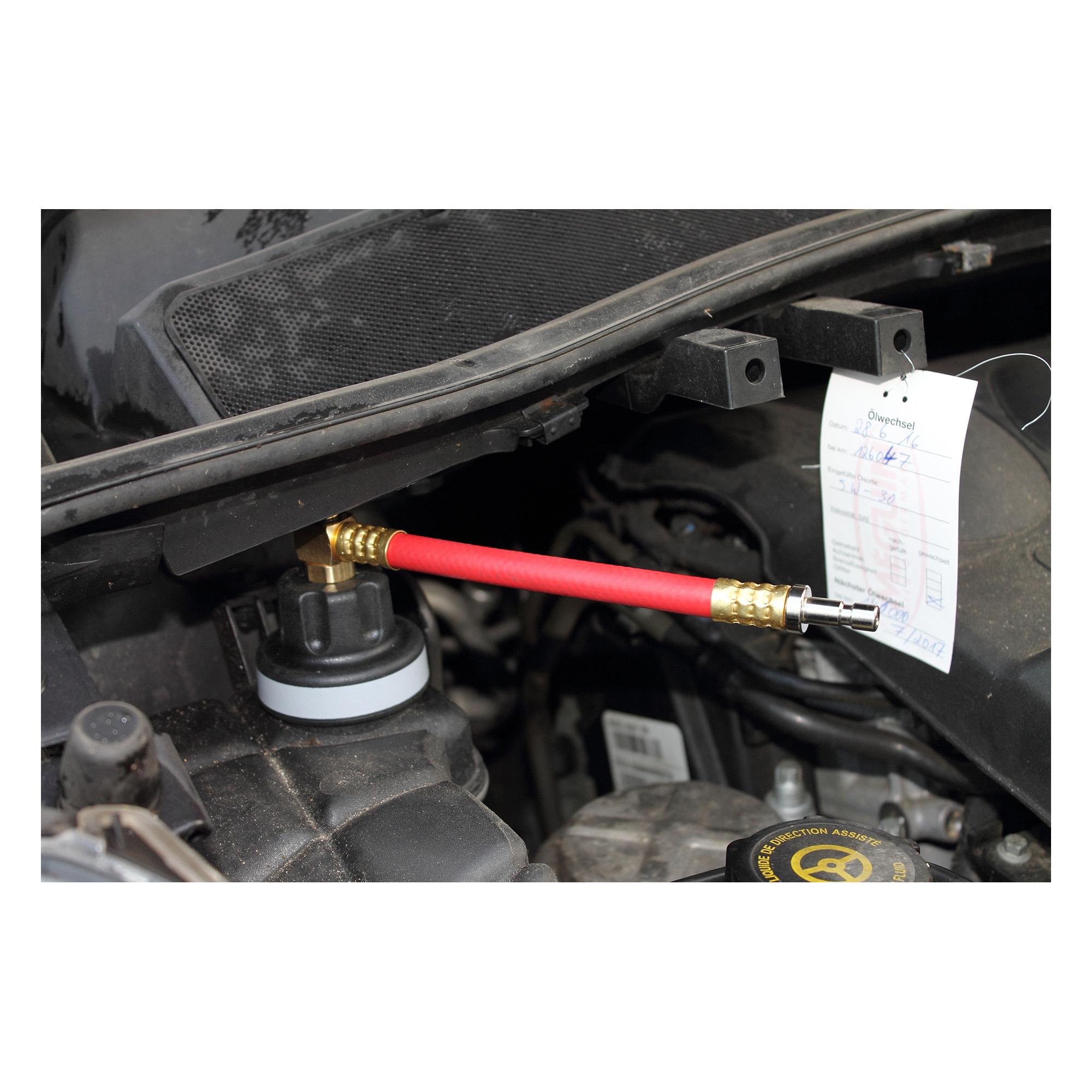 Abgewinkelter Adapter-Schlauch zum Einschrauben in alle bei uns erhältlichen Kühlmittel Abdrückadapter. Speziell für enge Platzverhältnisse, wenn oberhalb des Behälters nicht genug Freiraum für die Kühlmitteldruckpumpe vorhanden ist.