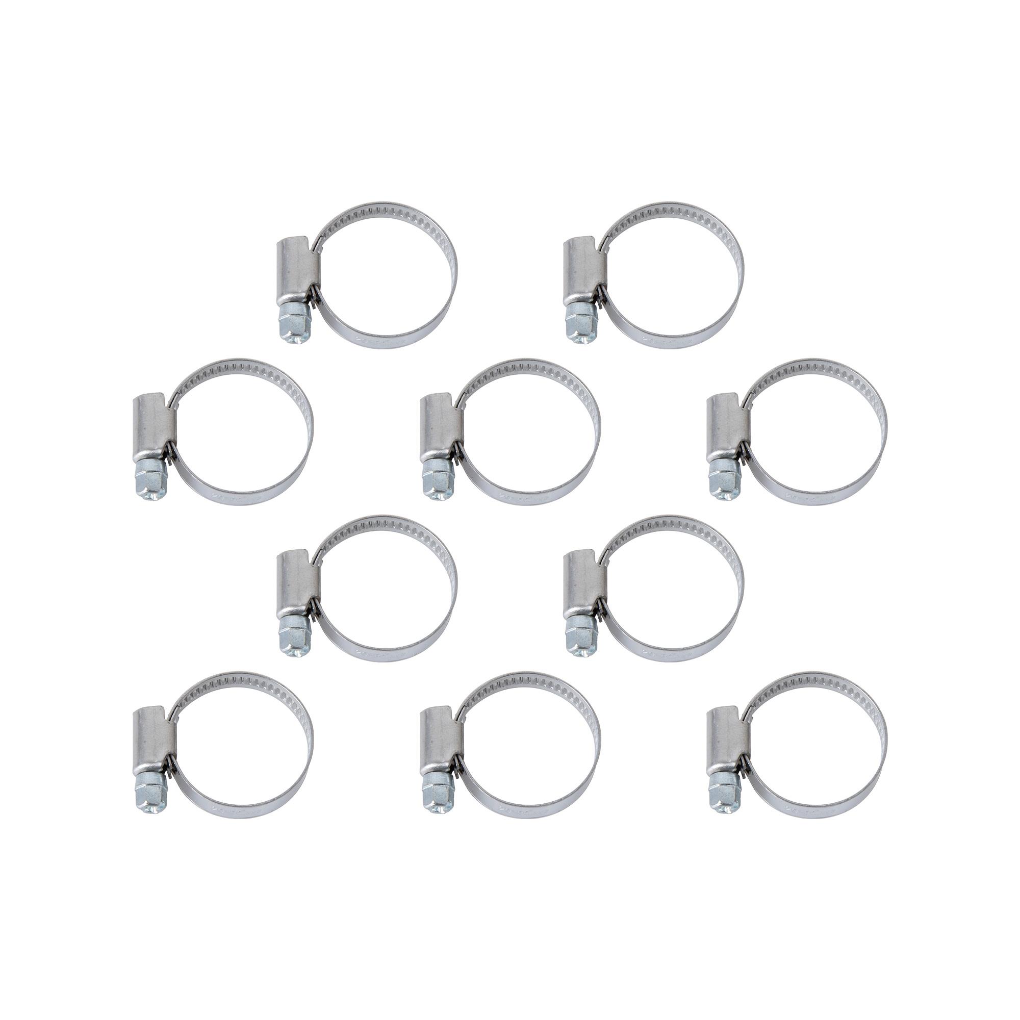 Vielseitig einsetzbare Schlauchschellen, im 10er-Pack, aus Edelstahl, mit 9 mm Bandbreite und gewalztem Gewinde. Die Antriebsschnecke und das Gehäuse sind aus verzinktem Stahl gefertigt.
