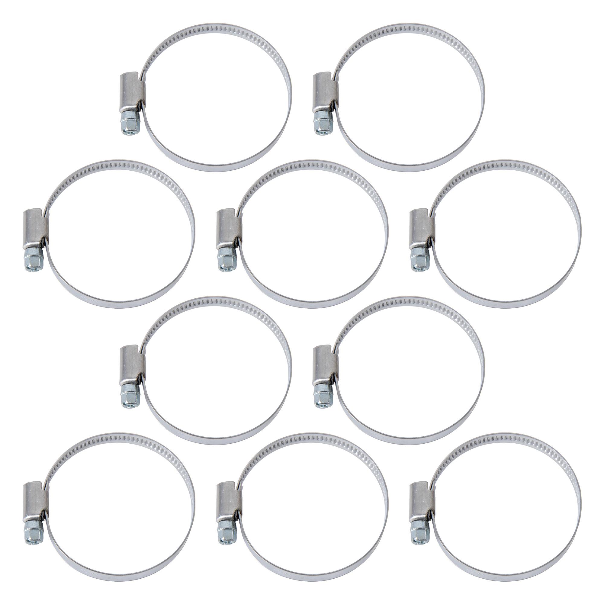 Vielseitig einsetzbare Schlauchschellen, im 10er-Pack, aus Edelstahl, mit 9 mm Bandbreite und gewalztem Gewinde. Die Antriebsschnecke und das Gehäuse sind aus verzinktem Stahl gefertigt.