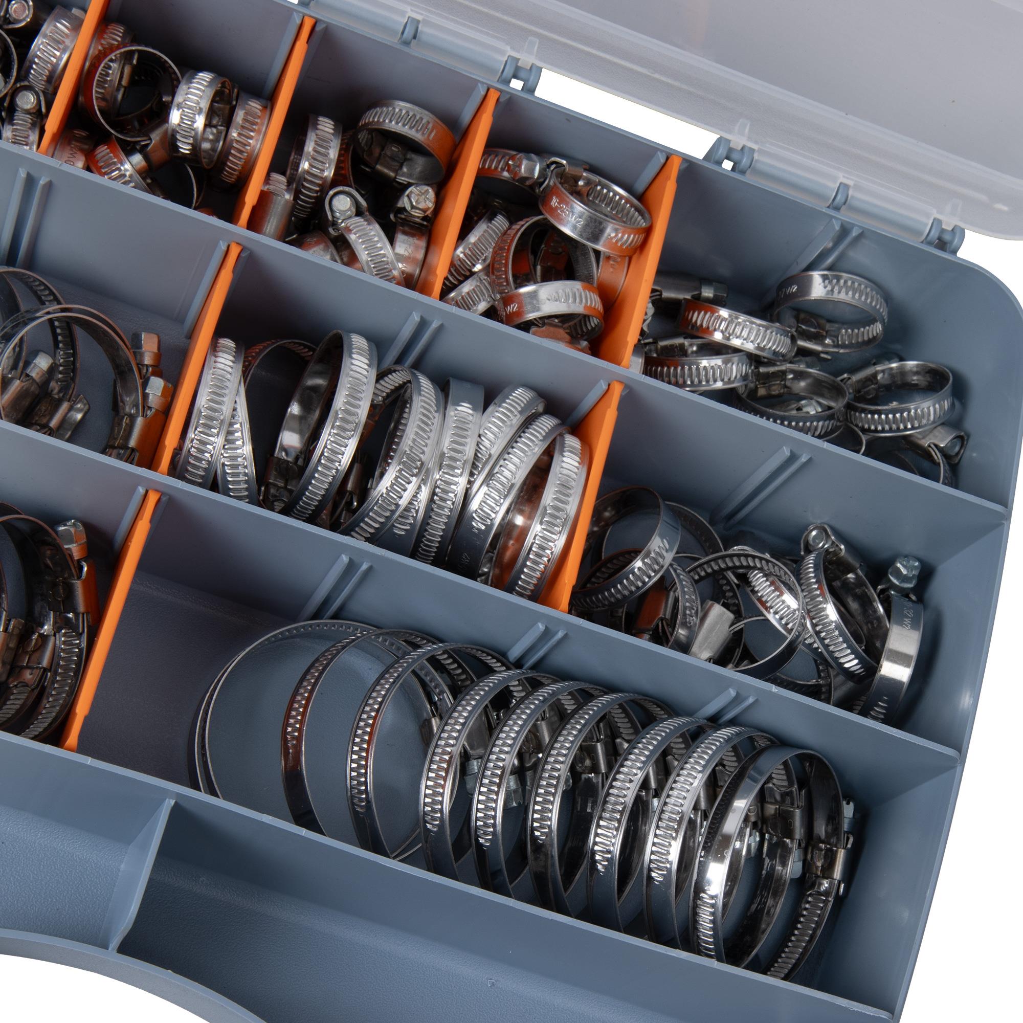 Vielseitig einsetzbare Schlauchschellen, 110 Stück, im praktischen Sortimentskoffer. Die Schlauchschellen sind aus Edelstahl, mit 9 mm Bandbreite und gewalztem Gewinde. Die Antriebsschnecke und das Gehäuse sind aus verzinktem Stahl gefertigt.